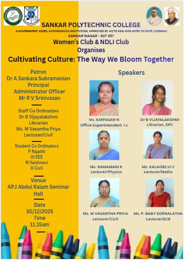 Excited to share that Sankar Polytechnic College's Women's Club & NDLI Club is organizing "Cultivating Culture: The Way We Bloom Together" - a meaningful program celebrating women's contributions to education and society.