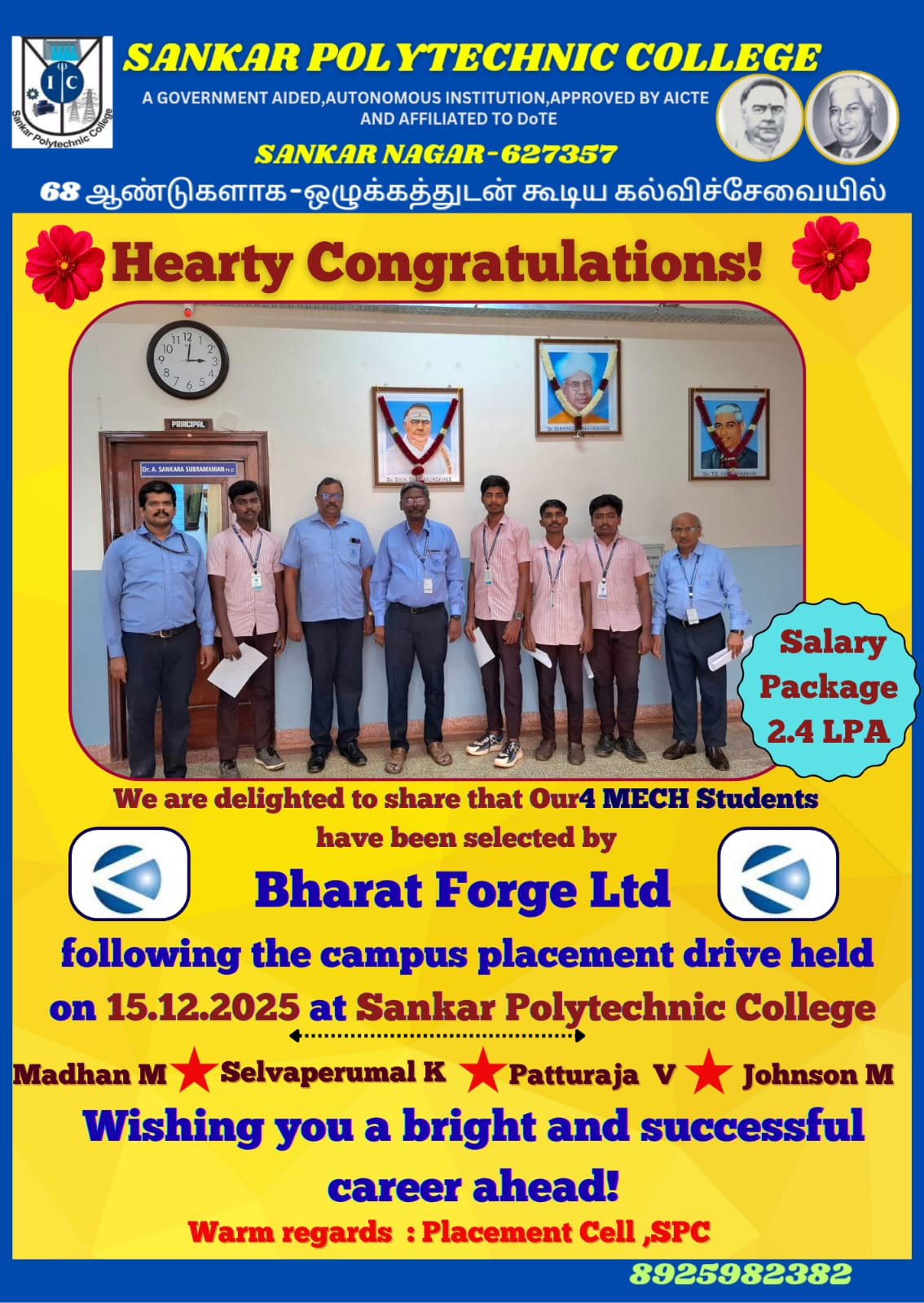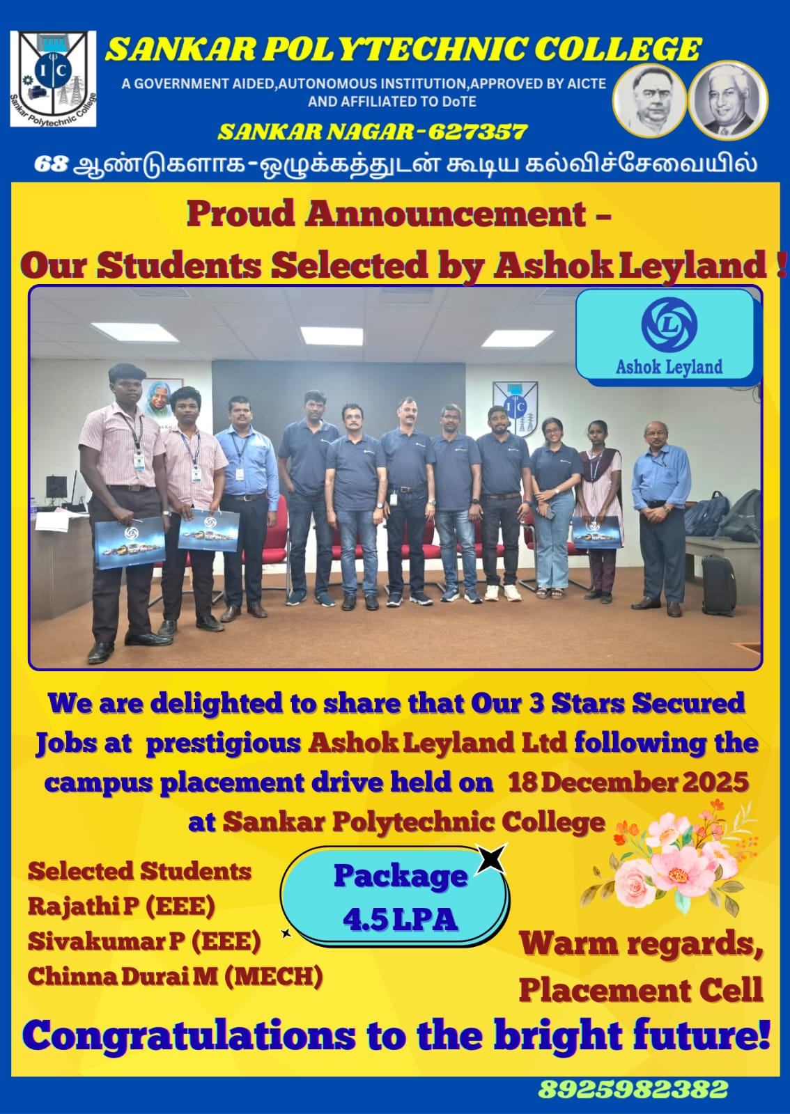 This achievement is a testament to the quality education and industry-focused training we provide at Sankar Polytechnic College. Our campus placement drive held on December 18, 2025, has opened doors to bright careers for our talented students.